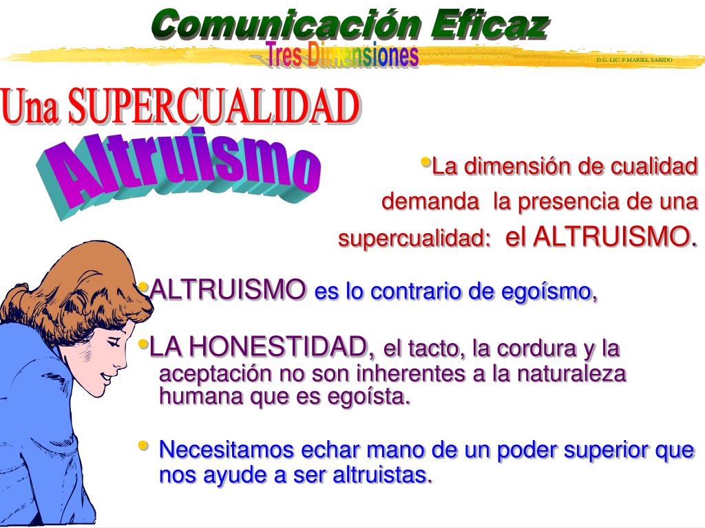 Una SUPERCUALIDAD •La dimensión de cualidad demanda la presencia de una supercualidad: el ALTRUISMO. •ALTRUISMO es lo contrario de egoísmo, •LA HONESTIDAD, el tacto, la cordura y la aceptación no son inherentes a la naturaleza humana que es egoísta. • Necesitamos echar mano de un poder superior que nos ayude a ser altruistas. Altruismo