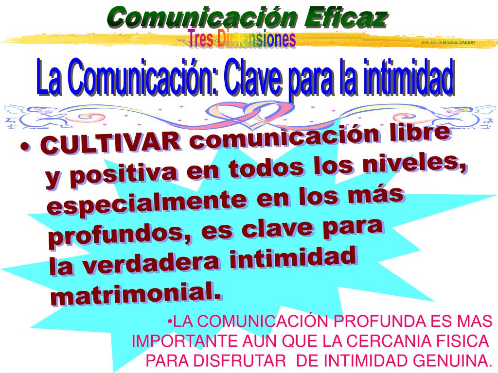La Comunicación: Clave para la intimidad • CULTIVAR comunicación libre y positiva en todos los niveles, especialmente en los más profundos, es clave para la verdadera intimidad matrimonial. •LA COMUNICACIÓN PROFUNDA ES MAS IMPORTANTE AUN QUE LA CERCANIA FISICA PARA DISFRUTAR DE INTIMIDAD GENUINA.