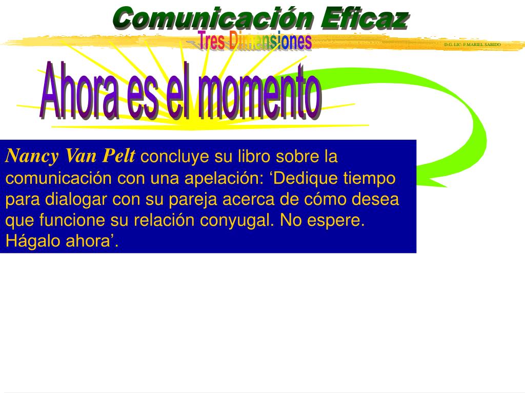 Ahora es el momento Nancy Van Pelt concluye su libro sobre la comunicación con una apelación: ‘Dedique tiempo para dialogar con su pareja acerca de cómo desea que funcione su relación conyugal. No espere. Hágalo ahora’.
