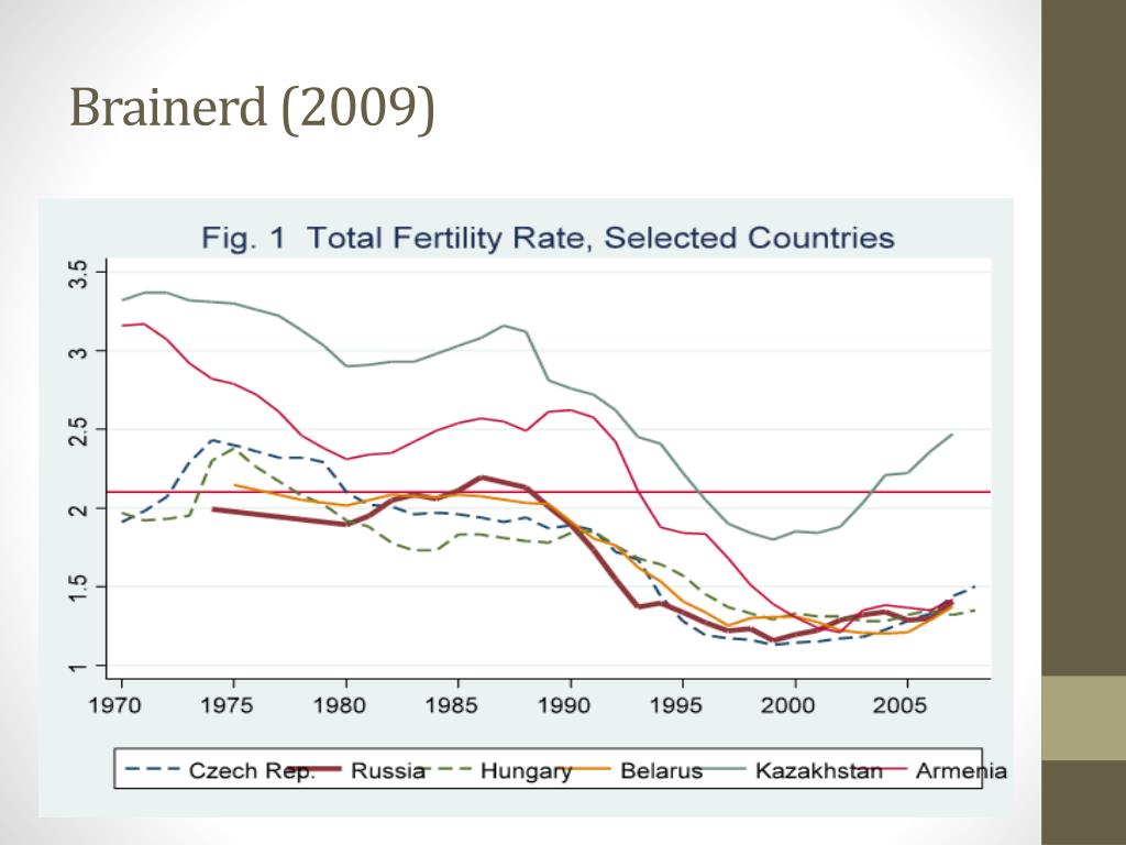 Brainerd (2009) • U poslednjih 20. godina tranzicione ekonomije doživele su velike demografske promene • Rusija: veliki pad populacije još od ranih 1990tih • Putinova vlada 2006: veća socijalna pomoć za decu i $9000 za drugo dete • I u ostalim tranzicionim ekonomijama značajno je smanjen broj novorođenčadi a povećana stopa smrtnosti • Rusija: stopa smrtnosti (broj umrlih na svakih 100.000 stanovnika) porasla za 70% 1990-94; životni vek muškaraca smanjen sa 63,7 na 57,4 god. a žena sa 74,3 na 71,1 god.
