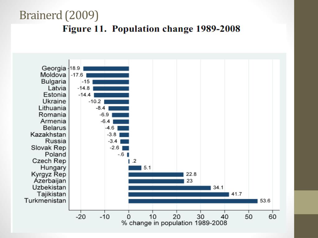 Populacija i tranzicija: Brainerd (2009) U Rusiji visoka stopa smrtnosti muškaraca uzrasta 25-54. dovodi do: • velikog gubitka najproduktivnijeg ljudskog kapitala • predstavlja negativan šok za ekonomski rast • skraćuje individualni vremenski period prilikom donošenja odluke o investicijama što utiče na pad investicija u ljudski i fizički kapital i smanjuje razvojne potencijale u regionu Obrnuto se dešava u CEE gde pored smanjenja smrtnosti dolazi do poboljšanja zdravlja što podstiče investicije i rast