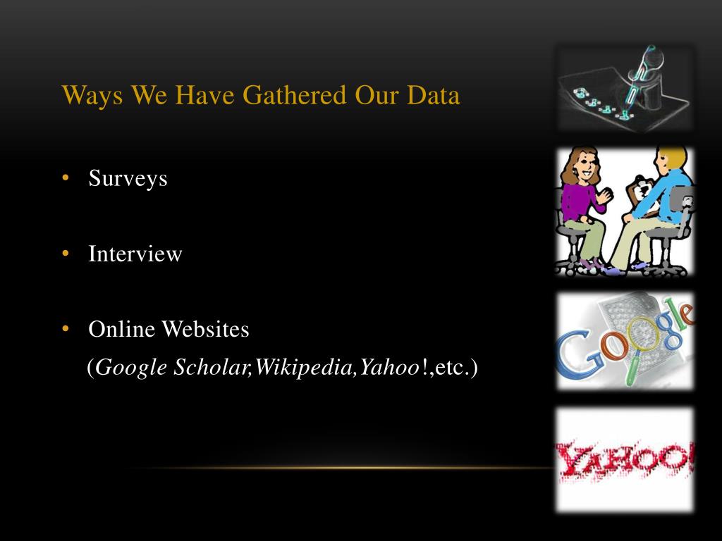 Ways We Have Gathered Our Data • Surveys • Interview • Online Websites (Google Scholar,Wikipedia,Yahoo!,etc.)