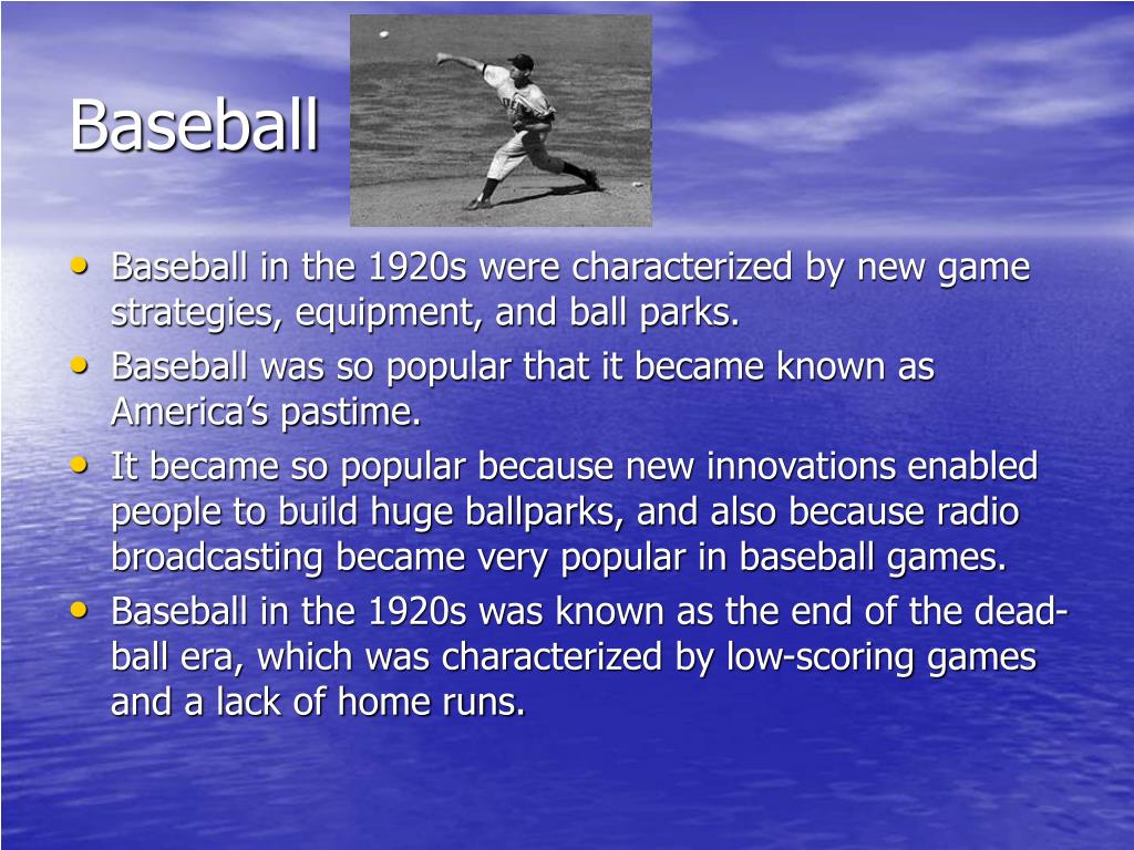 Baseball • Baseball in the 1920s were characterized by new game strategies, equipment, and ball parks. • Baseball was so popular that it became known as America’s pastime. • It became so popular because new innovations enabled people to build huge ballparks, and also because radio broadcasting became very popular in baseball games. • Baseball in the 1920s was known as the end of the dead-ball era, which was characterized by low-scoring games and a lack of home runs.