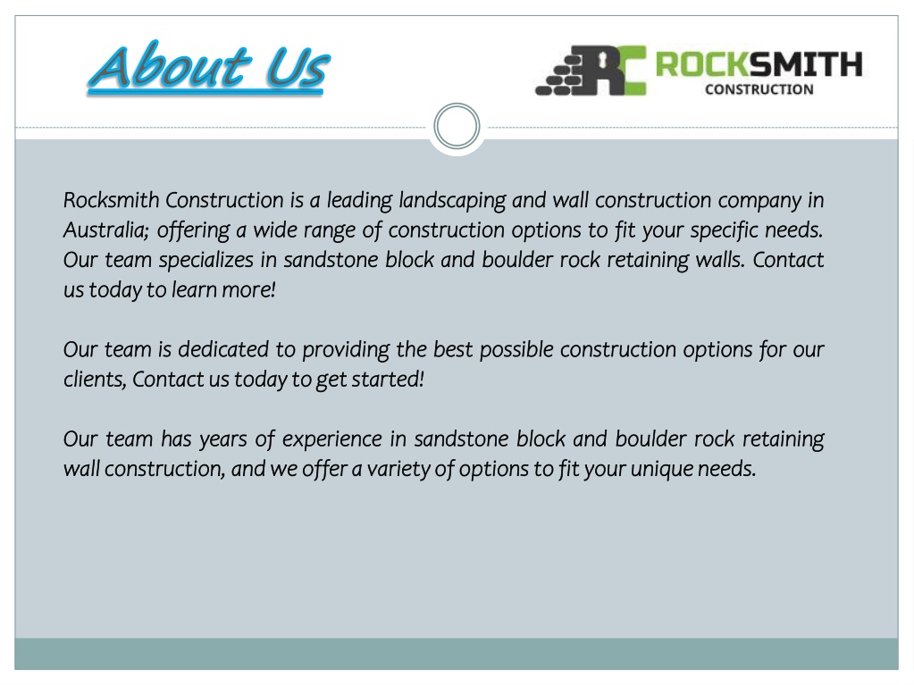 About Us Rocksmith Construction is a leading landscaping and wall construction company in Australia; offering a wide range of construction options to fit your specific needs. Our team specializes in sandstone block and boulder rock retaining walls. Contact us today to learn more! Our team is dedicated to providing the best possible construction options for our clients, Contact us today to get started! Our team has years of experience in sandstone block and boulder rock retaining wall construction, and we offer a variety of options to fit your unique needs.