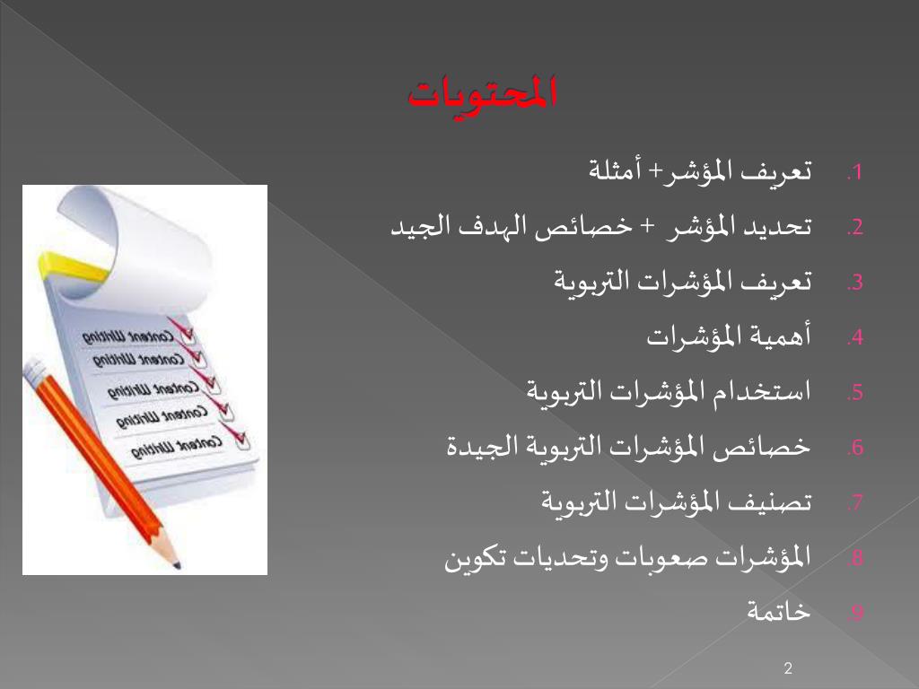 المحتويات • تعريف المؤشر +أمثلة • تحديد المؤشر + خصائص الهدف الجيد • تعريف المؤشرات التربوية • أهمية المؤشرات • استخدام المؤشرات التربوية • خصائص المؤشرات التربوية الجيدة • تصنيف المؤشرات التربوية • المؤشراتصعوبات وتحديات تكوين • خاتمة