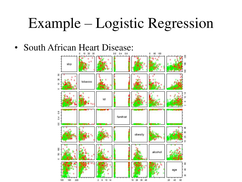 Example – Logistic Regression • South African Heart Disease: • Coronary risk factor study (CORIS) baseline survey, carried out in three rural areas. • White males b/w 15 and 64 • Response: presence or absence of myocardial infarction • Maximum likelihood fit: