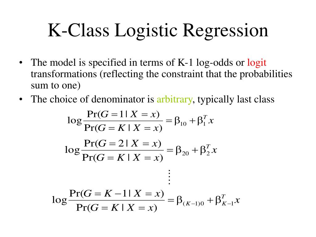 K-Class Logistic Regression • The model is specified in terms of K-1 log-odds or logit transformations (reflecting the constraint that the probabilities sum to one) • The choice of denominator is arbitrary, typically last class …..