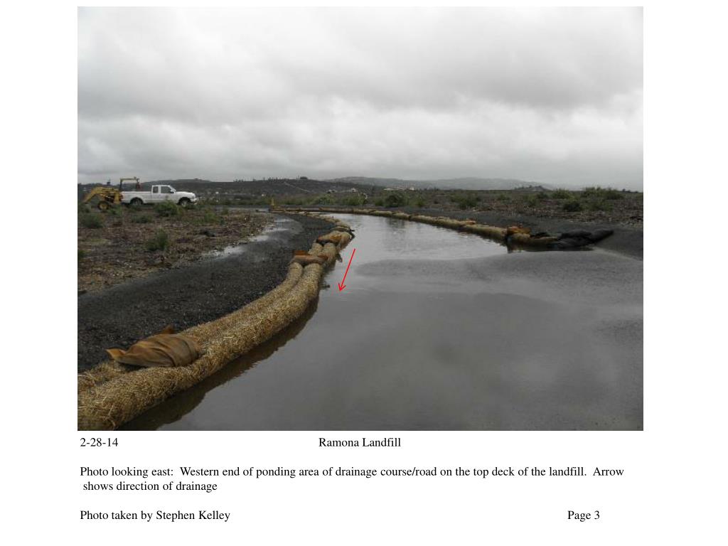 2-28-14 Ramona Landfill Photo looking east: Western end of ponding area of drainage course/road on the top deck of the landfill. Arrow shows direction of drainage Photo taken by Stephen Kelley Page 3