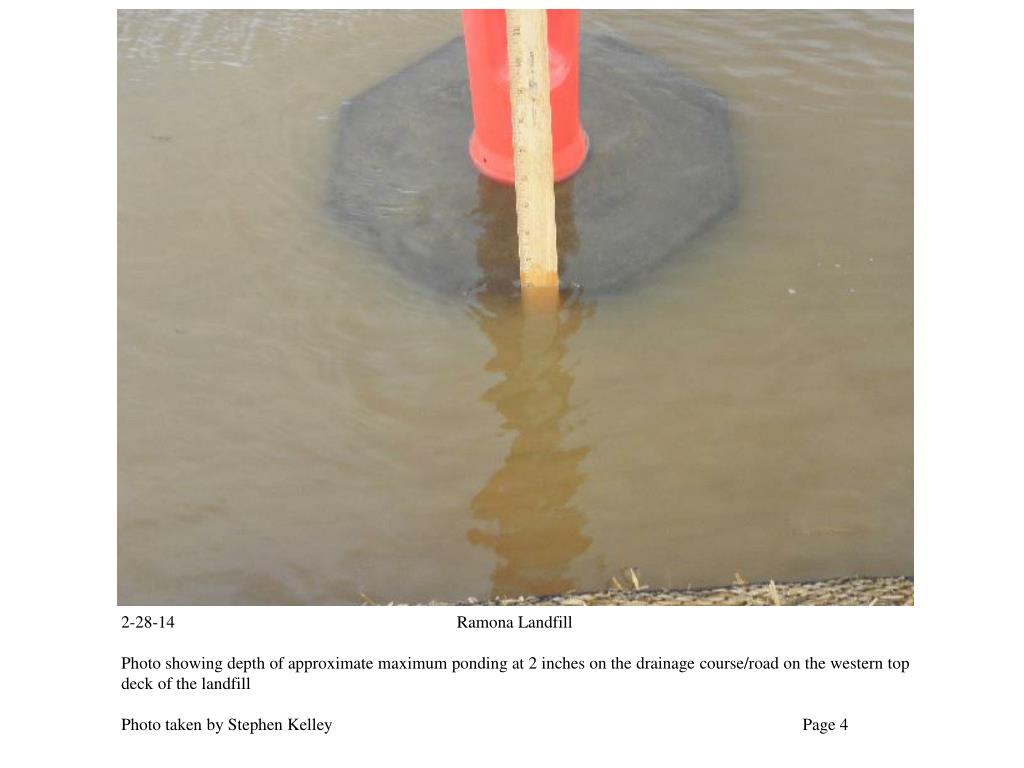 2-28-14 Ramona Landfill Photo showing depth of approximate maximum ponding at 2 inches on the drainage course/road on the western top deck of the landfill Photo taken by Stephen Kelley Page 4