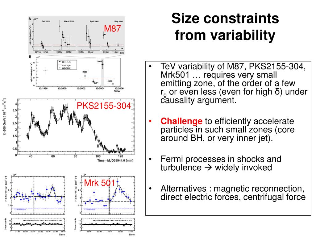 Size constraints from variability M87 • TeV variability of M87, PKS2155-304, Mrk501 … requires very small emitting zone, of the order of a few rg or even less (even for high δ) under causality argument. • Challengeto efficiently accelerate particles in such small zones (core around BH, or very inner jet). • Fermi processes in shocks and turbulence widely invoked • Alternatives : magnetic reconnection, direct electric forces, centrifugal force PKS2155-304 Mrk 501