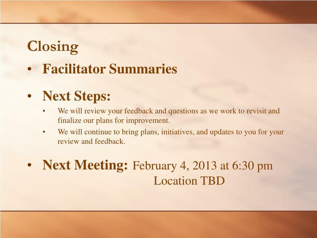 Closing • Facilitator Summaries • Next Steps: • We will review your feedback and questions as we work to revisit and finalize our plans for improvement. • We will continue to bring plans, initiatives, and updates to you for your review and feedback. • Next Meeting:February 4, 2013 at 6:30 pm Location TBD
