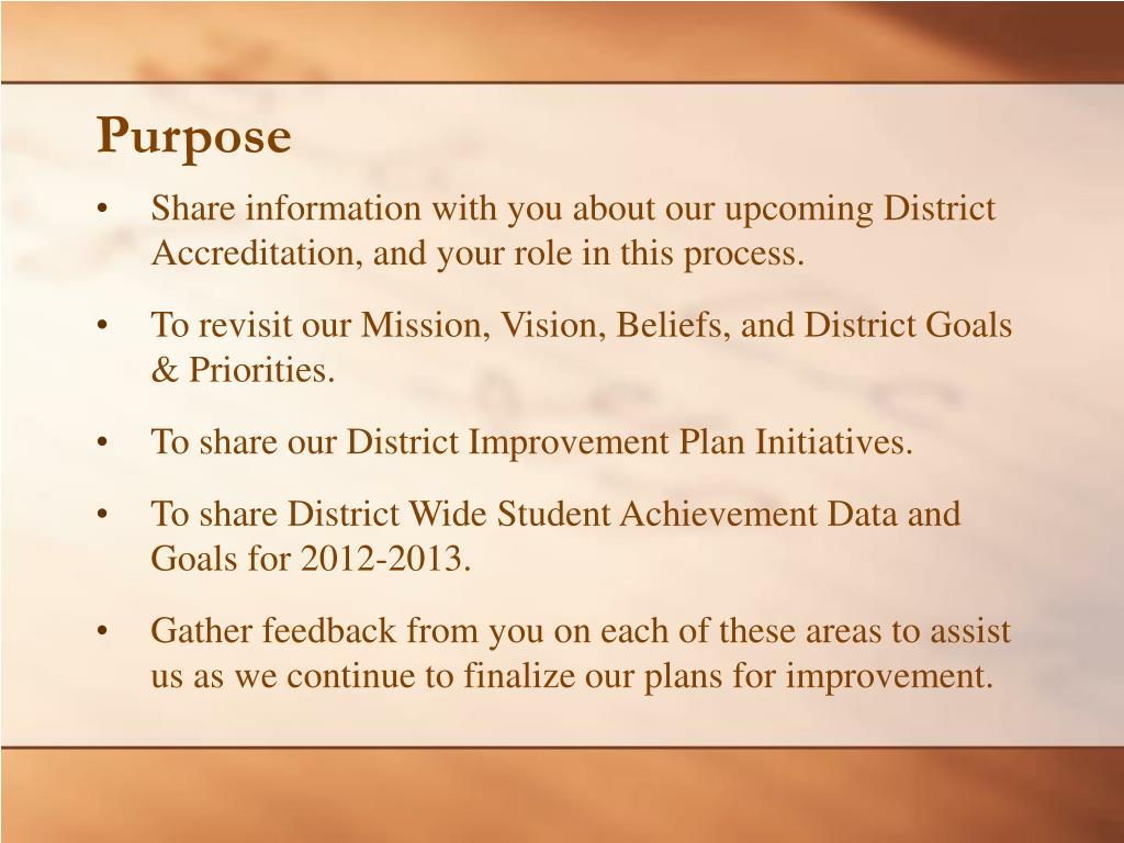Purpose • Share information with you about our upcoming District Accreditation, and your role in this process. • To revisit our Mission, Vision, Beliefs, and District Goals & Priorities. • To share our District Improvement Plan Initiatives. • To share District Wide Student Achievement Data and Goals for 2012-2013. • Gather feedback from you on each of these areas to assist us as we continue to finalize our plans for improvement.