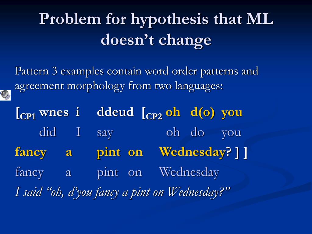 Problem for hypothesis that ML doesn’t change Pattern 3 examples contain word order patterns and agreement morphology from two languages: [CP1wnesi ddeud[CP2oh d(o) you did I say oh do you fancy a pint on Wednesday?] ] fancy a pint on Wednesday I said “oh, d’you fancy a pint on Wednesday?”
