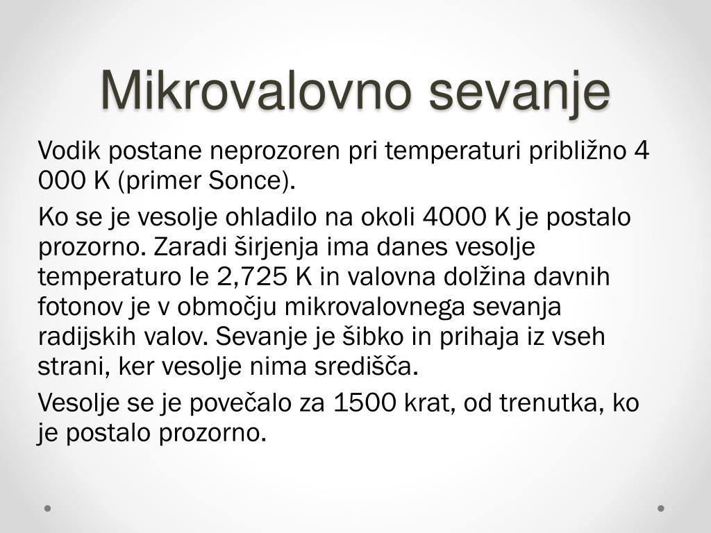 Mikrovalovno sevanje Vodik postane neprozoren pri temperaturi približno 4 000 K (primer Sonce). Ko se je vesolje ohladilo na okoli 4000 K je postalo prozorno. Zaradi širjenja ima danes vesolje temperaturo le 2,725 K in valovna dolžina davnih fotonov je v območju mikrovalovnega sevanja radijskih valov. Sevanje je šibko in prihaja iz vseh strani, ker vesolje nima središča. Vesolje se je povečalo za 1500 krat, od trenutka, ko je postalo prozorno.