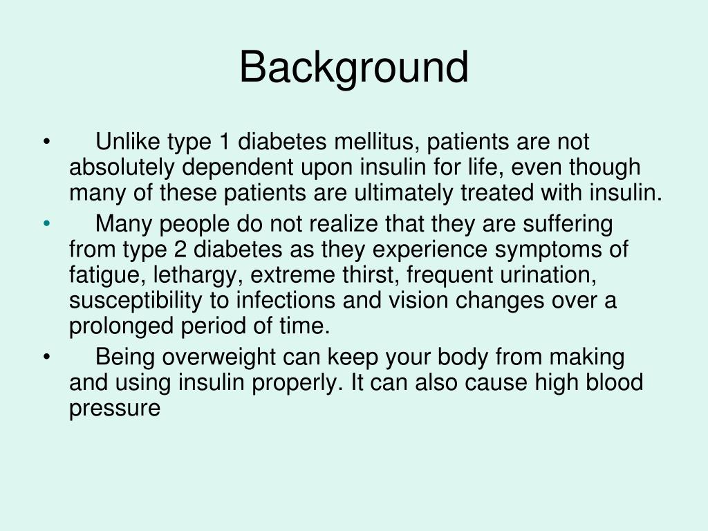 Background • Unlike type 1 diabetes mellitus, patients are not absolutely dependent upon insulin for life, even though many of these patients are ultimately treated with insulin. • Many people do not realize that they are suffering from type 2 diabetes as they experience symptoms of fatigue, lethargy, extreme thirst, frequent urination, susceptibility to infections and vision changes over a prolonged period of time. • Being overweight can keep your body from making and using insulin properly. It can also cause high blood pressure