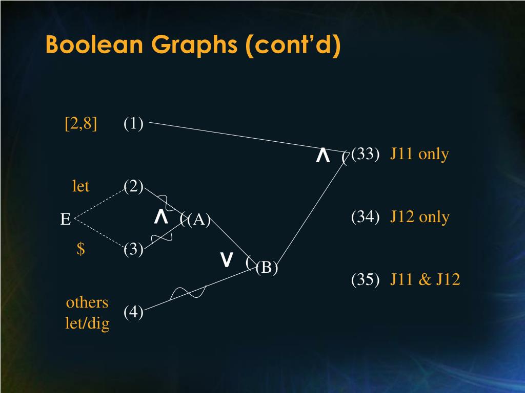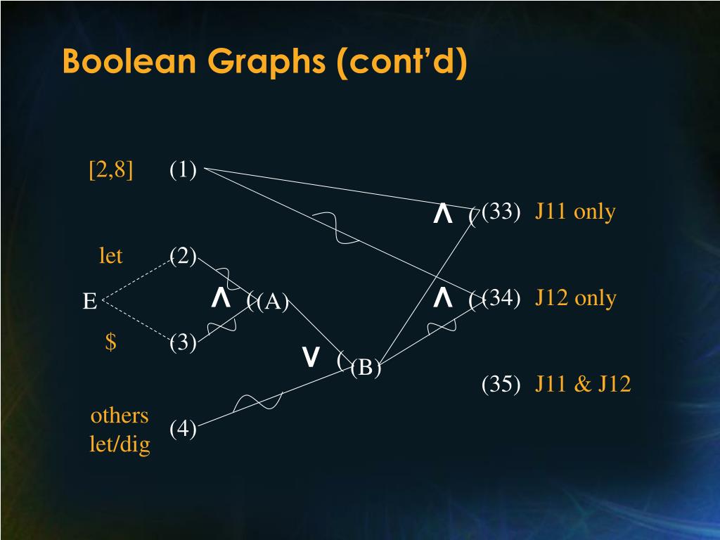 Boolean Graphs (cont’d) [2,8] let $ (1) (2) (3) (4) (33) (34) (35) J11 only J12 only J11 & J12 E others let/dig