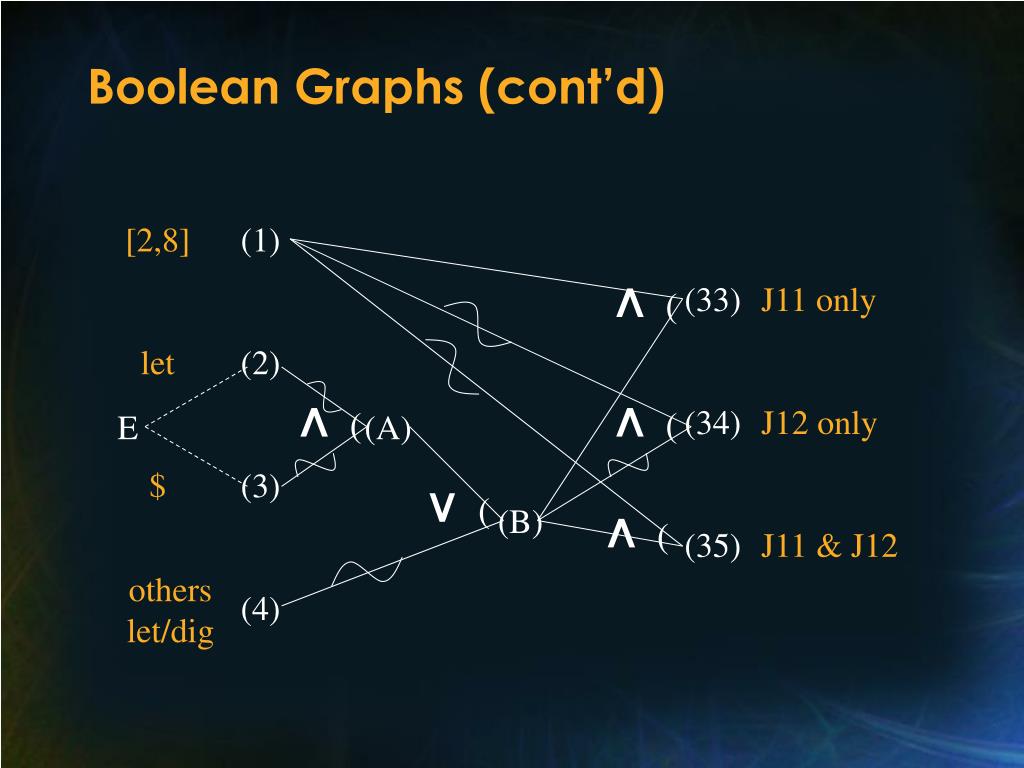 Boolean Graphs (cont’d) [2,8] let $ (1) (2) (3) (4) Л (33) (34) (35) J11 only J12 only J11 & J12 Л Л E (A) V (B) Л others let/dig