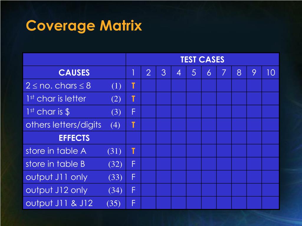 Another Cause-Effect Example: Symbol Table Storage Specification The conditions for storing an identifier in one of two symbol tables are: (a) must be from 2 to 8 characters in length; (b) first character must be a letter or “$”; (c) other characters must be a letter or digit. If the first character is a letter, the identifier will be stored in symbol table A. If the first character is “$”, it will be stored in symbol table B. If the first character is neither a letter nor “$”, or if condition (c) is not satisfied, error message J11 is output. If condition (a) is not satisfied, error message J12 is output.