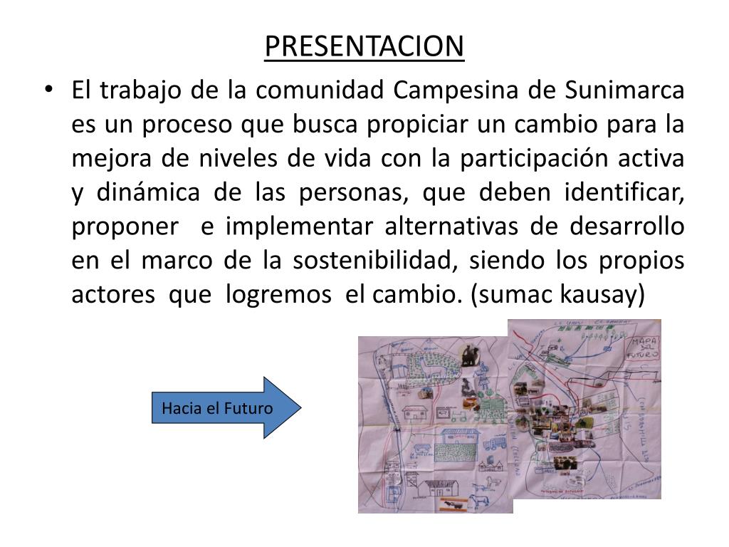 PRESENTACION • El trabajo de la comunidad Campesina de Sunimarca es un proceso que busca propiciar un cambio para la mejora de niveles de vida con la participación activa y dinámica de las personas, que deben identificar, proponer e implementar alternativas de desarrollo en el marco de la sostenibilidad, siendo los propios actores que logremos el cambio. (sumackausay) Hacia el Futuro