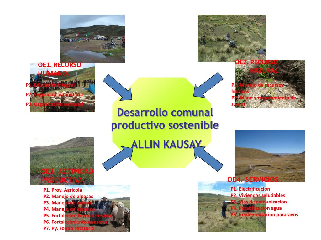 OE2. RECURSO NATURAL OE1. RECURSO HUMANO. P1. Educación integral P2. Seguridad alimentaría P3. Organización comunal P1. Manejo de recursos hídricos P2. Mano y mejoramiento de suelos Desarrollo comunal productivo sostenible ALLIN KAUSAY OE3. ACTIVIDAD PRODUCTIVA OE4. SERVICIOS P1. Electrificacion P2. Viviendas saludables P3. Vias de comunicacion P4. Potabilizacion agua P5. Implementacionpararayos P1. Proy. Agricola P2. Manejo de alpacas P3. Manejo de ovinos P4. Manejo de vacunos P5. Fortalecim. Mype artesanal P6. Fortalecimiento queseria P7. Py. Fondo rotatorio