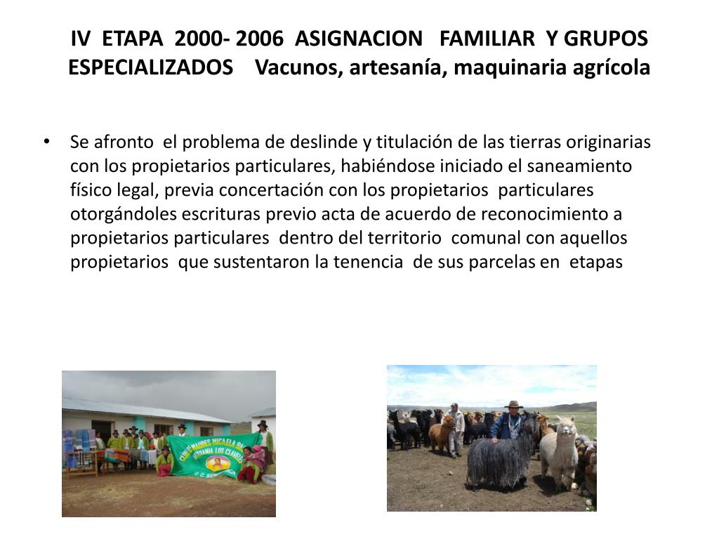 IV ETAPA 2000- 2006 ASIGNACION FAMILIAR Y GRUPOS ESPECIALIZADOS Vacunos, artesanía, maquinaria agrícola • Se afronto el problema de deslinde y titulación de las tierras originarias con los propietarios particulares, habiéndose iniciado el saneamiento físico legal, previa concertación con los propietarios particulares otorgándoles escrituras previo acta de acuerdo de reconocimiento a propietarios particulares dentro del territorio comunal con aquellos propietarios que sustentaron la tenencia de sus parcelas en etapas