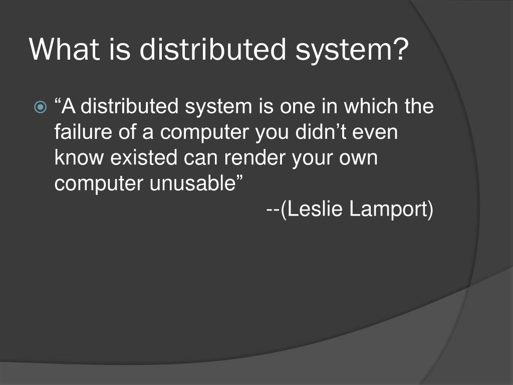 What is distributed system? • “A distributed system is one in which the failure of a computer you didn’t even know existed can render your own computer unusable” --(Leslie Lamport)
