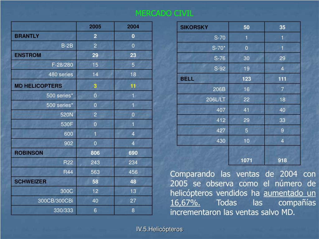 MERCADO CIVIL Comparando las ventas de 2004 con 2005 se observa como el número de helicópteros vendidos ha aumentado un 16,67%. Todas las compañías incrementaron las ventas salvo MD. IV.5.Helicópteros