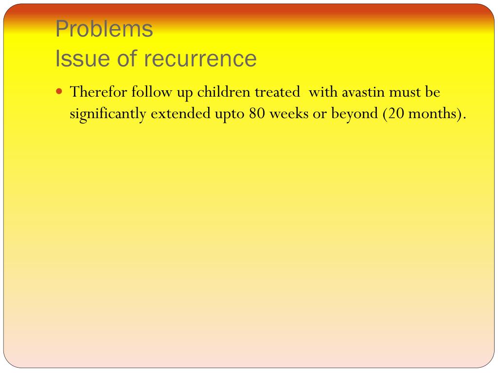 ProblemsIssue of recurrence • Therefor follow up children treated with avastin must be significantly extended upto80 weeks or beyond (20 months).
