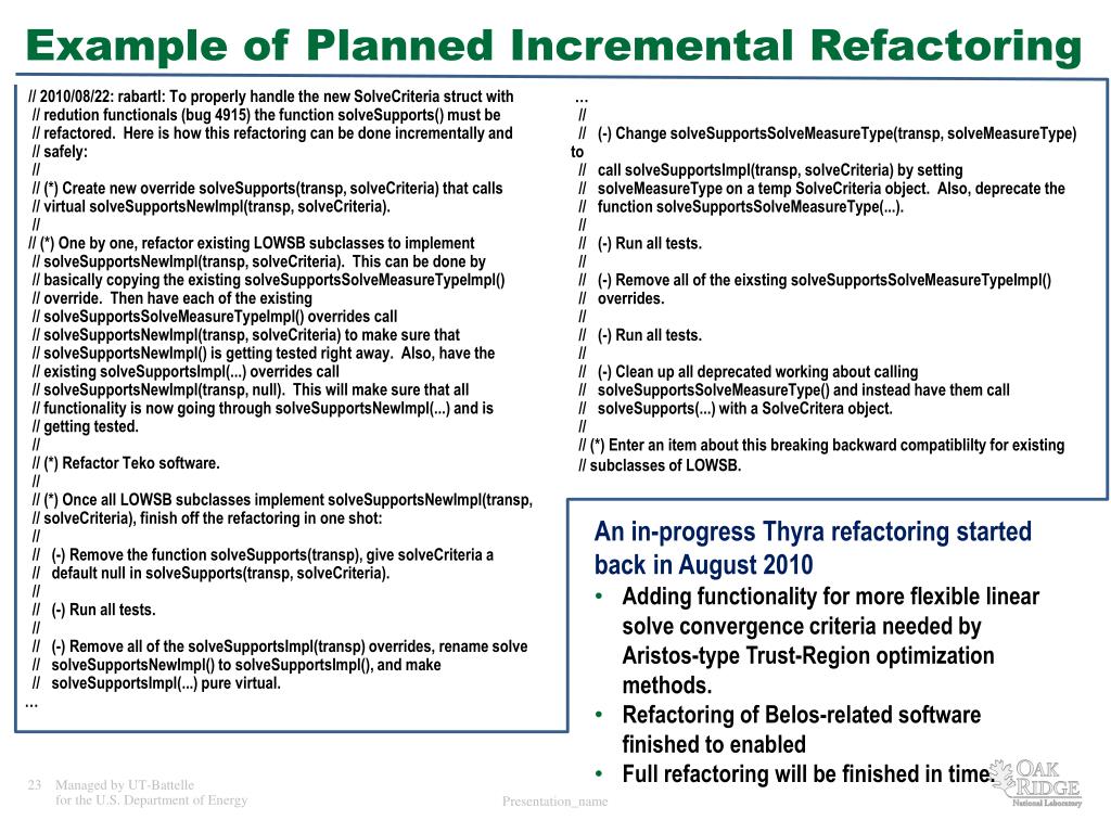 Example of Planned Incremental Refactoring … // // (-) Change solveSupportsSolveMeasureType(transp, solveMeasureType) to // call solveSupportsImpl(transp, solveCriteria) by setting // solveMeasureType on a temp SolveCriteria object. Also, deprecate the // function solveSupportsSolveMeasureType(...). // // (-) Run all tests. // // (-) Remove all of the eixstingsolveSupportsSolveMeasureTypeImpl() // overrides. // // (-) Run all tests. // // (-) Clean up all deprecated working about calling // solveSupportsSolveMeasureType() and instead have them call // solveSupports(...) with a SolveCritera object. // // (*) Enter an item about this breaking backward compatiblilty for existing // subclasses of LOWSB. // 2010/08/22: rabartl: To properly handle the new SolveCriteriastruct with // redutionfunctionals (bug 4915) the function solveSupports() must be // refactored. Here is how this refactoring can be done incrementally and // safely: // // (*) Create new override solveSupports(transp, solveCriteria) that calls // virtual solveSupportsNewImpl(transp, solveCriteria). // // (*) One by one, refactor existing LOWSB subclasses to implement // solveSupportsNewImpl(transp, solveCriteria). This can be done by // basically copying the existing solveSupportsSolveMeasureTypeImpl() // override. Then have each of the existing // solveSupportsSolveMeasureTypeImpl() overrides call // solveSupportsNewImpl(transp, solveCriteria) to make sure that // solveSupportsNewImpl() is getting tested right away. Also, have the // existing solveSupportsImpl(...) overrides call // solveSupportsNewImpl(transp, null). This will make sure that all // functionality is now going through solveSupportsNewImpl(...) and is // getting tested. // // (*) Refactor Teko software. // // (*) Once all LOWSB subclasses implement solveSupportsNewImpl(transp, // solveCriteria), finish off the refactoring in one shot: // // (-) Remove the function solveSupports(transp), give solveCriteria a // default null in solveSupports(transp, solveCriteria). // // (-) Run all tests. // // (-) Remove all of the solveSupportsImpl(transp) overrides, rename solve // solveSupportsNewImpl() to solveSupportsImpl(), and make // solveSupportsImpl(...) pure virtual. … An in-progress Thyra refactoring started back in August 2010 • Adding functionality for more flexible linear solve convergence criteria needed by Aristos-type Trust-Region optimization methods. • Refactoring of Belos-related software finished to enabled • Full refactoring will be finished in time.