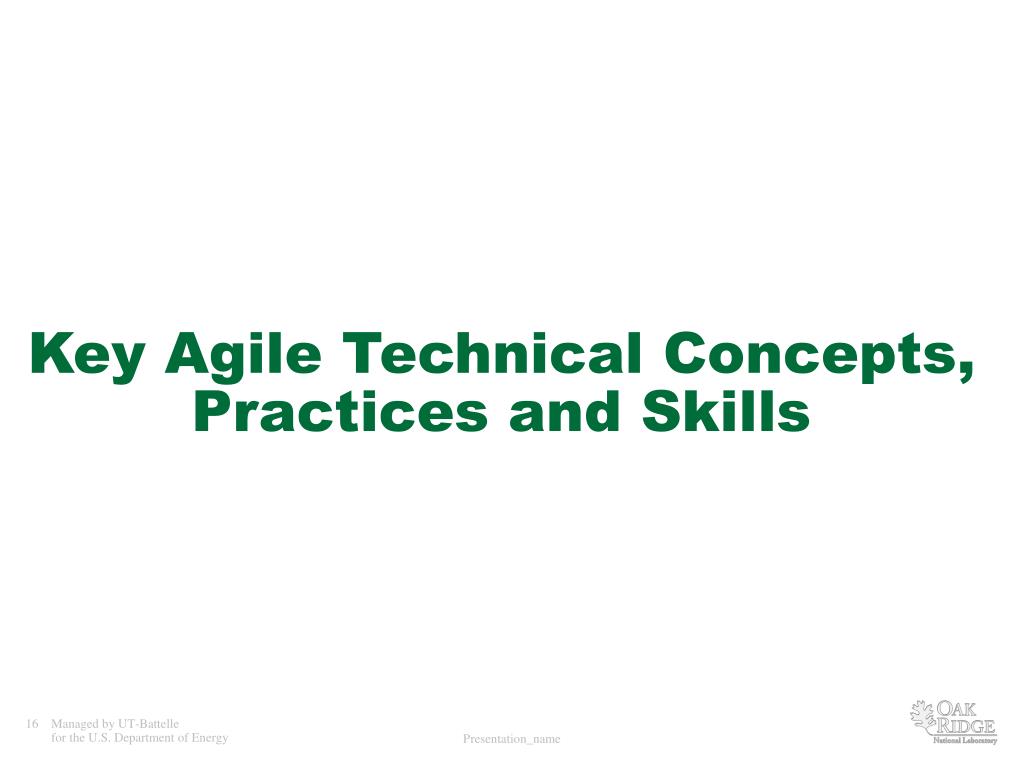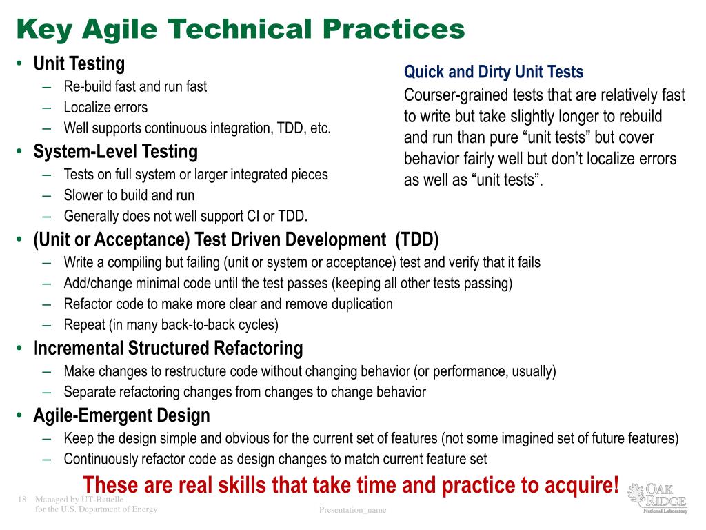Key Agile Technical Practices Quick and Dirty Unit Tests Courser-grained tests that are relatively fast to write but take slightly longer to rebuild and run than pure “unit tests” but cover behavior fairly well but don’t localize errors as well as “unit tests”. • Unit Testing • Re-build fast and run fast • Localize errors • Well supports continuous integration, TDD, etc. • System-Level Testing • Tests on full system or larger integrated pieces • Slower to build and run • Generally does not well support CI or TDD. • (Unit or Acceptance) Test Driven Development (TDD) • Write a compiling but failing (unit or system or acceptance) test and verify that it fails • Add/change minimal code until the test passes (keeping all other tests passing) • Refactor code to make more clear and remove duplication • Repeat (in many back-to-back cycles) • Incremental Structured Refactoring • Make changes to restructure code without changing behavior (or performance, usually) • Separate refactoring changes from changes to change behavior • Agile-Emergent Design • Keep the design simple and obvious for the current set of features (not some imagined set of future features) • Continuously refactor code as design changes to match current feature set These are real skills that take time and practice to acquire!