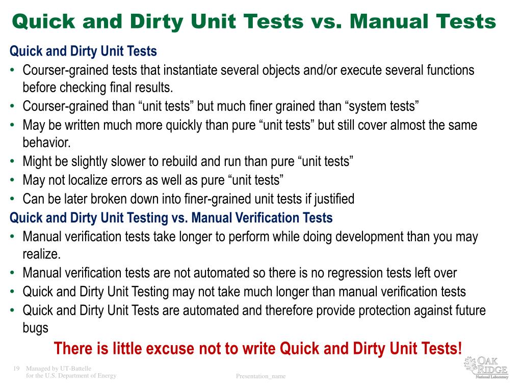 Quick and Dirty Unit Tests vs. Manual Tests Quick and Dirty Unit Tests • Courser-grained tests that instantiate several objects and/or execute several functions before checking final results. • Courser-grained than “unit tests” but much finer grained than “system tests” • May be written much more quickly than pure “unit tests” but still cover almost the same behavior. • Might be slightly slower to rebuild and run than pure “unit tests” • May not localize errors as well as pure “unit tests” • Can be later broken down into finer-grained unit tests if justified Quick and Dirty Unit Testing vs. Manual Verification Tests • Manual verification tests take longer to perform while doing development than you may realize. • Manual verification tests are not automated so there is no regression tests left over • Quick and Dirty Unit Testing may not take much longer than manual verification tests • Quick and Dirty Unit Tests are automated and therefore provide protection against future bugs There is little excuse not to write Quick and Dirty Unit Tests!