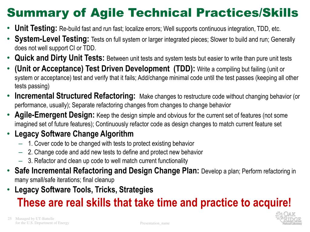 Summary of Agile Technical Practices/Skills • Unit Testing: Re-build fast and run fast; localize errors; Well supports continuous integration, TDD, etc. • System-Level Testing: Tests on full system or larger integrated pieces; Slower to build and run; Generally does not well support CI or TDD. • Quick and Dirty Unit Tests: Between unit tests and system tests but easier to write than pure unit tests • (Unit or Acceptance) Test Driven Development (TDD): Write a compiling but failing (unit or system or acceptance) test and verify that it fails; Add/change minimal code until the test passes (keeping all other tests passing) • Incremental Structured Refactoring: Make changes to restructure code without changing behavior (or performance, usually); Separate refactoring changes from changes to change behavior • Agile-Emergent Design: Keep the design simple and obvious for the current set of features (not some imagined set of future features); Continuously refactor code as design changes to match current feature set • Legacy Software Change Algorithm • 1. Cover code to be changed with tests to protect existing behavior • 2. Change code and add new tests to define and protect new behavior • 3. Refactor and clean up code to well match current functionality • Safe Incremental Refactoring and Design Change Plan: Develop a plan; Perform refactoring in many small/safe iterations; final cleanup • Legacy Software Tools, Tricks, Strategies These are real skills that take time and practice to acquire!