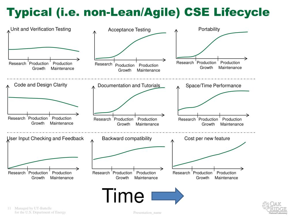 Typical (i.e. non-Lean/Agile) CSE Lifecycle Unit and Verification Testing Portability Acceptance Testing Research Production Growth Production Maintenance Research Production Growth Production Maintenance Research Production Growth Production Maintenance Code and Design Clarity Documentation and Tutorials Space/Time Performance Research Production Growth Production Maintenance Research Production Growth Production Maintenance Research Production Growth Production Maintenance Cost per new feature User Input Checking and Feedback Backward compatibility Research Production Growth Production Maintenance Research Production Growth Production Maintenance Research Production Growth Production Maintenance Time