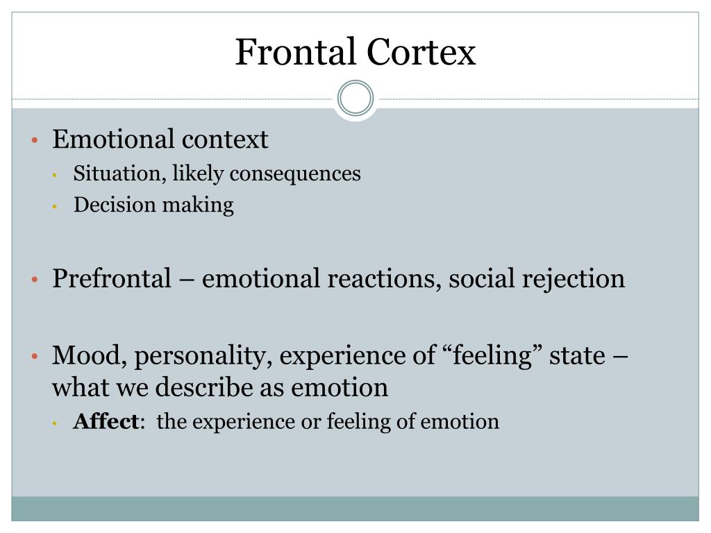 Frontal Cortex • Emotional context • Situation, likely consequences • Decision making • Prefrontal – emotional reactions, social rejection • Mood, personality, experience of “feeling” state – what we describe as emotion • Affect: the experience or feeling of emotion