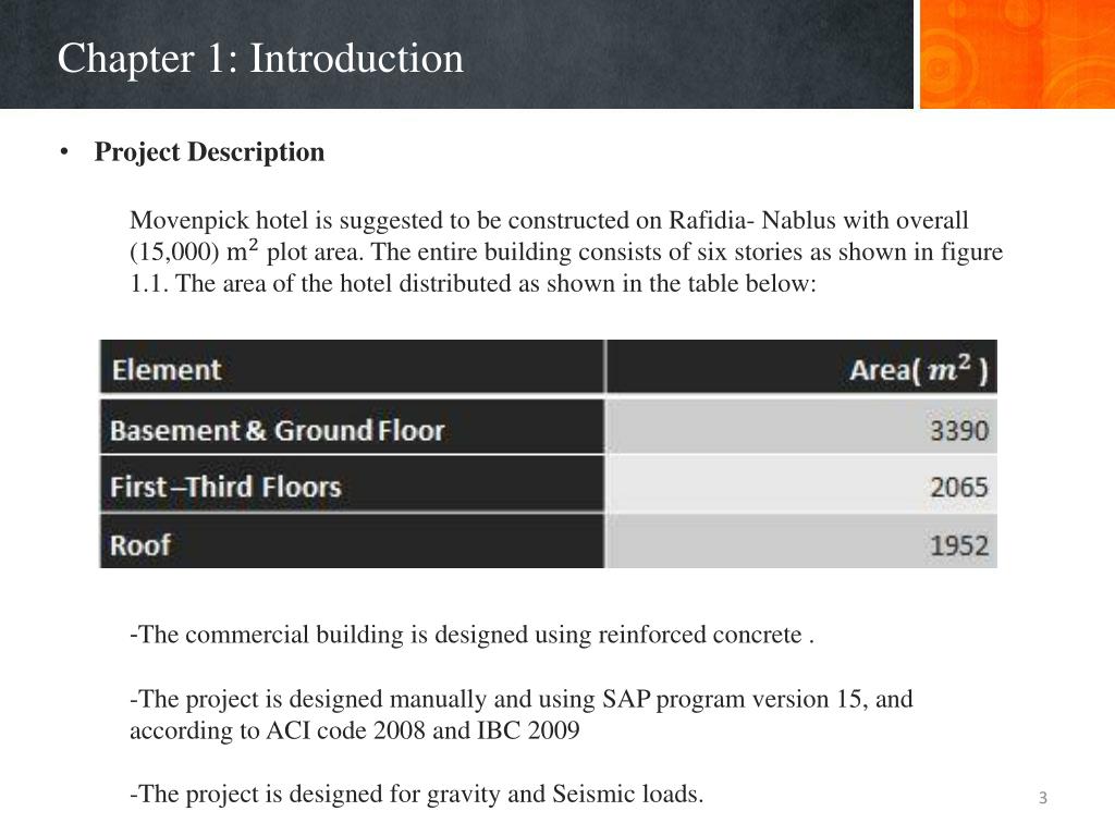 Chapter 1: Introduction • Project Description • Movenpick hotel is suggested to be constructed on Rafidia- Nablus with overall (15,000) plot area. The entire building consists of six stories as shown in figure 1.1. The area of the hotel distributed as shown in the table below: -The commercial building is designed using reinforced concrete . -The project is designed manually and using SAP program version 15, and according to ACI code 2008 and IBC 2009 -The project is designed for gravity and Seismic loads.