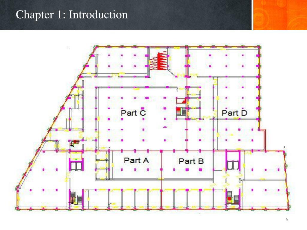 Chapter 1: Introduction Design codes and load analysis -ACI code and IBC code are used in the project -Load analysis: Dead load : own weigh +SIDL SIDL=3.79 KN/m² SIDL=4.79 KN/m² Live load =5 KN/m² Live load =2.5 KN/m² -Load combination: 1.2D+1.6L