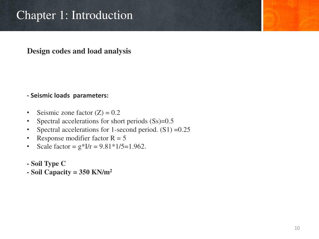 Chapter 1: Introduction Design codes and load analysis • - Seismic loads parameters: • Seismic zone factor (Z) = 0.2 • Spectral accelerations for short periods (Ss)=0.5 • Spectral accelerations for 1-second period. (S1) =0.25 • Response modifier factor R = 5 • Scalefactor = g*I/r = 9.81*1/5=1.962. • - Soil Type C • - Soil Capacity = 350 KN/m2