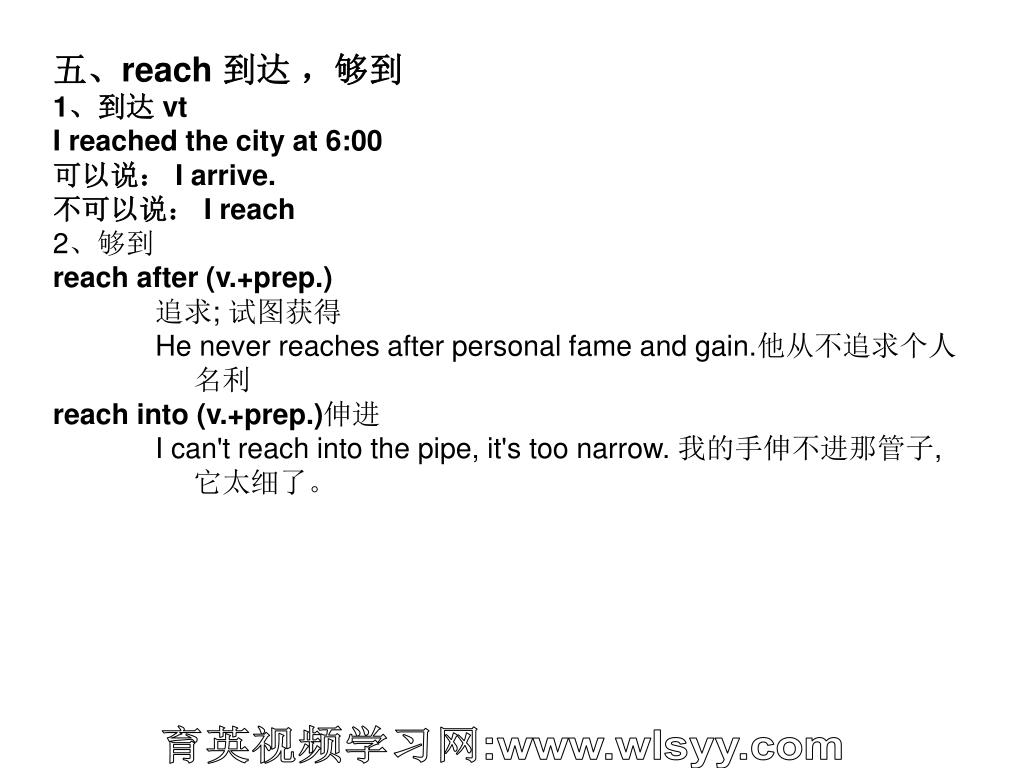 五、reach 到达 ,够到 • 1、到达 vt • I reached the city at 6:00 • 可以说: I arrive. • 不可以说: I reach • 2、够到 • reach after (v.+prep.) • 追求; 试图获得 • He never reaches after personal fame and gain.他从不追求个人名利 • reach into (v.+prep.)伸进 • I can't reach into the pipe, it's too narrow. 我的手伸不进那管子,它太细了。