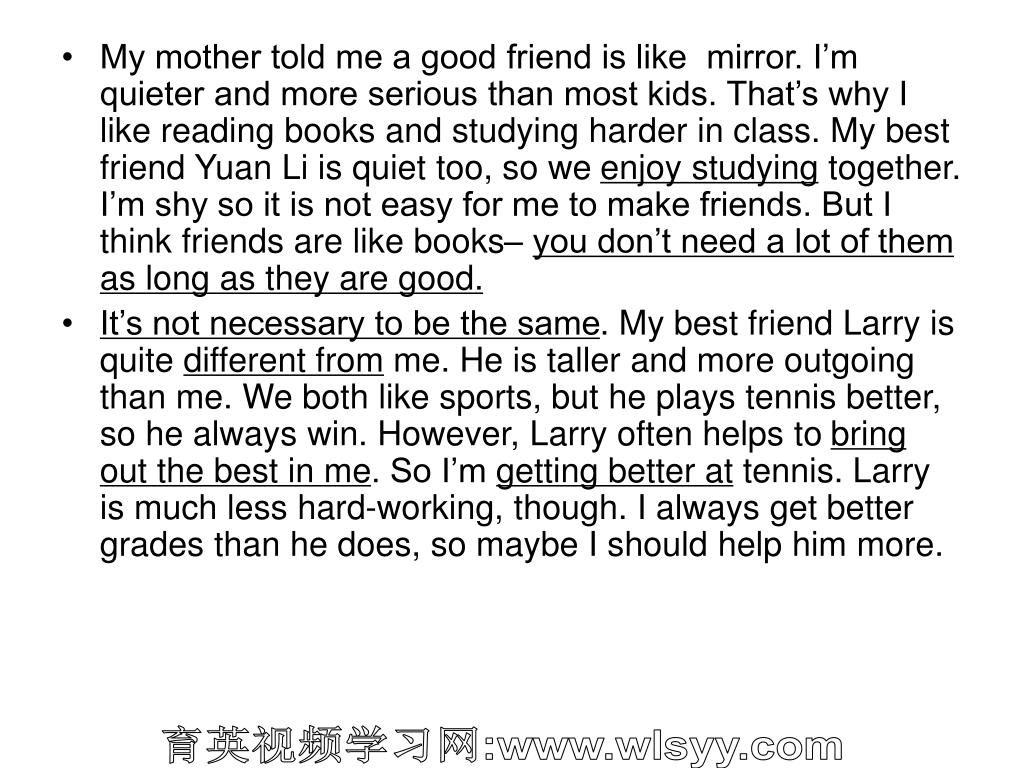 My mother told me a good friend is like mirror. I’m quieter and more serious than most kids. That’s why I like reading books and studying harder in class. My best friend Yuan Li is quiet too, so we enjoy studying together. I’m shy so it is not easy for me to make friends. But I think friends are like books– you don’t need a lot of them as long as they are good. • It’s not necessary to be the same. My best friend Larry is quite different from me. He is taller and more outgoing than me. We both like sports, but he plays tennis better, so he always win. However, Larry often helps to bring out the best in me. So I’m getting better at tennis. Larry is much less hard-working, though. I always get better grades than he does, so maybe I should help him more.