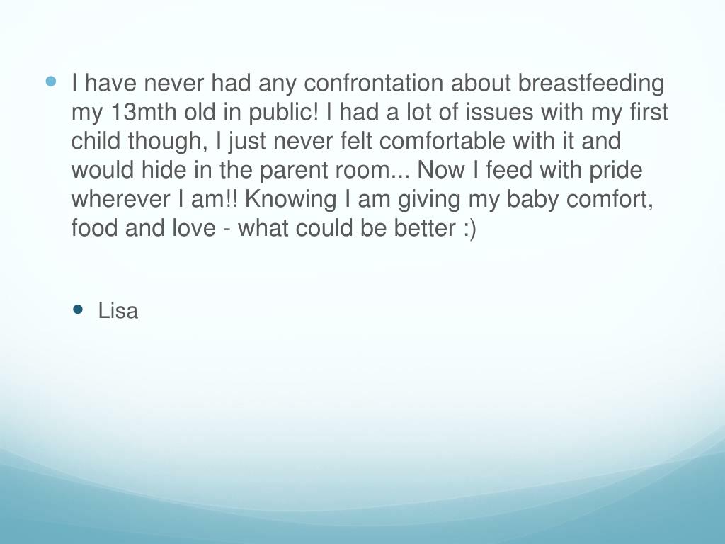 I have never had any confrontation about breastfeeding my 13mth old in public! I had a lot of issues with my first child though, I just never felt comfortable with it and would hide in the parent room... Now I feed with pride wherever I am!! Knowing I am giving my baby comfort, food and love - what could be better :) • Lisa