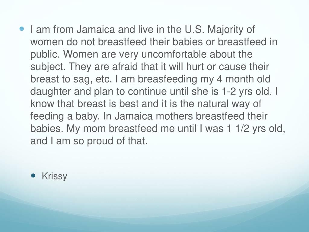 I am from Jamaica and live in the U.S. Majority of women do not breastfeed their babies or breastfeed in public. Women are very uncomfortable about the subject. They are afraid that it will hurt or cause their breast to sag, etc. I am breasfeeding my 4 month old daughter and plan to continue until she is 1-2 yrs old. I know that breast is best and it is the natural way of feeding a baby. In Jamaica mothers breastfeed their babies. My mom breastfeed me until I was 1 1/2 yrs old, and I am so proud of that. • Krissy