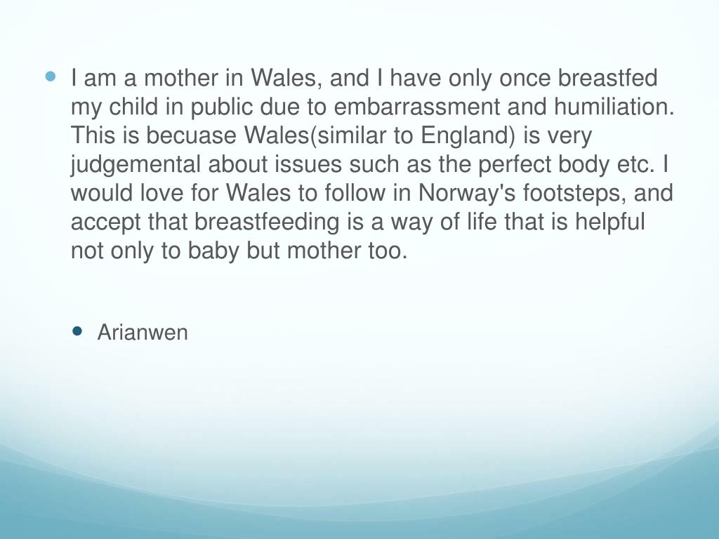 I am a mother in Wales, and I have only once breastfed my child in public due to embarrassment and humiliation. This is becuaseWales(similar to England) is very judgemental about issues such as the perfect body etc. I would love for Wales to follow in Norway's footsteps, and accept that breastfeeding is a way of life that is helpful not only to baby but mother too. • Arianwen