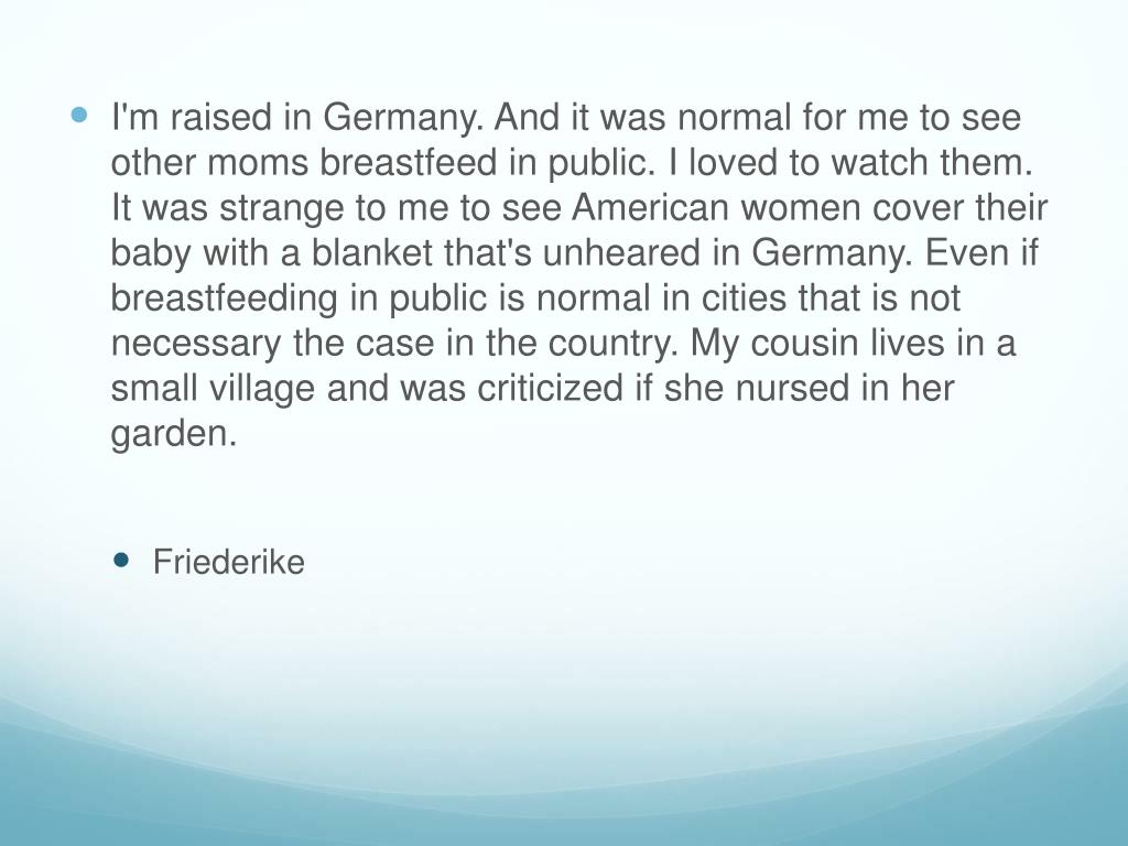 I'm raised in Germany. And it was normal for me to see other moms breastfeed in public. I loved to watch them. It was strange to me to see American women cover their baby with a blanket that's unheared in Germany. Even if breastfeeding in public is normal in cities that is not necessary the case in the country. My cousin lives in a small village and was criticized if she nursed in her garden. • Friederike