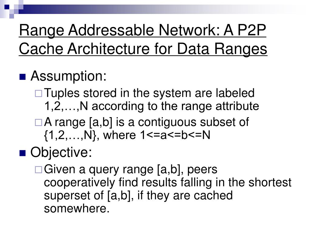 Range Addressable Network: A P2P Cache Architecture for Data Ranges • Assumption: • Tuples stored in the system are labeled 1,2,…,N according to the range attribute • A range [a,b] is a contiguous subset of {1,2,…,N}, where 1<=a<=b<=N • Objective: • Given a query range [a,b], peers cooperatively find results falling in the shortest superset of [a,b], if they are cached somewhere.