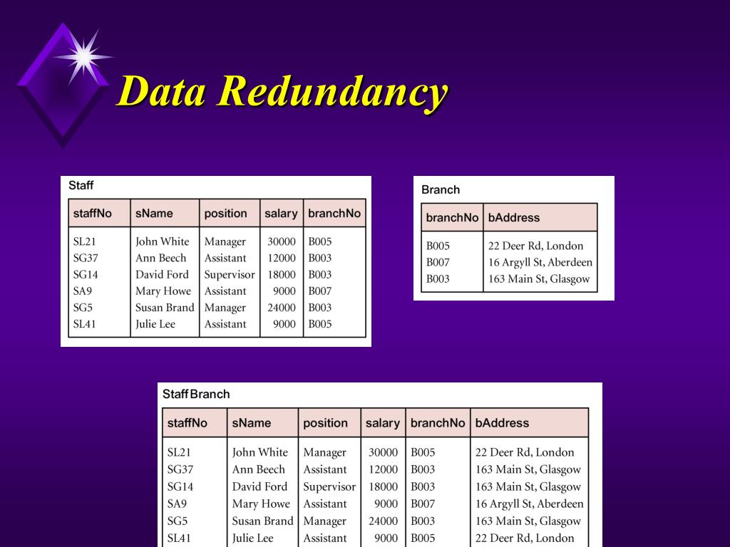 Data Redundancy • StaffBranch relation has redundant data: details of a branch are repeated for every member of staff. • In contrast, branch information appears only once for each branch in Branch relation and only branchNo is repeated in Staff relation, to represent where each member of staff works.