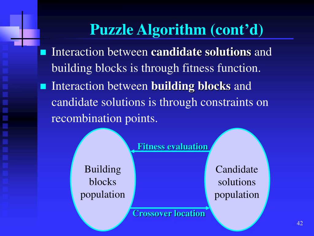 Building blocks population Candidate solutions population Puzzle Algorithm (cont’d) • Interaction between candidate solutions and building blocks is through fitness function. • Interaction between building blocks and candidate solutions is through constraints on recombination points. Fitness evaluation Crossover location