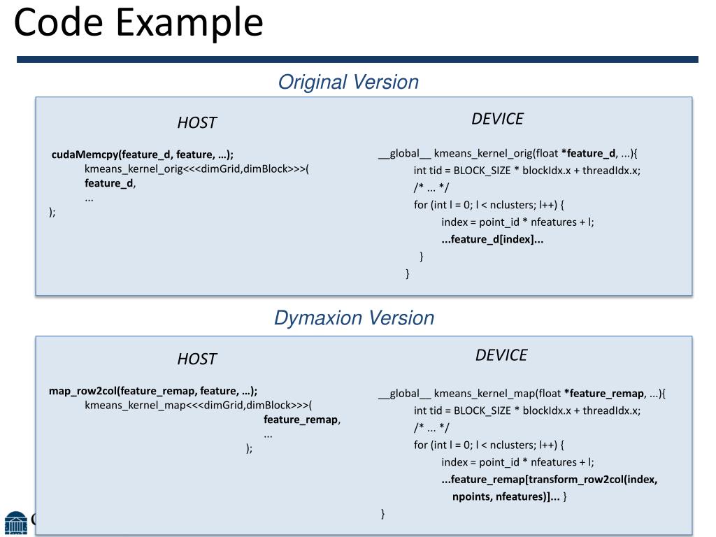 Code Example Original Version DEVICE __global__ kmeans_kernel_orig(float*feature_d, ...){ inttid = BLOCK_SIZE * blockIdx.x + threadIdx.x; /* ... */ for (intl = 0; l < nclusters; l++) { index = point_id * nfeatures + l; ...feature_d[index]... } } DEVICE __global__ kmeans_kernel_map(float*feature_remap, ...){ inttid = BLOCK_SIZE * blockIdx.x + threadIdx.x; /* ... */ for (intl = 0; l < nclusters; l++) { index = point_id * nfeatures + l; ...feature_remap[transform_row2col(index, npoints, nfeatures)]... } } HOST cudaMemcpy(feature_d, feature, …); kmeans_kernel_orig<<<dimGrid,dimBlock>>>( feature_d, ... ); HOST map_row2col(feature_remap, feature, …); kmeans_kernel_map<<<dimGrid,dimBlock>>>( feature_remap, ... ); Dymaxion Version