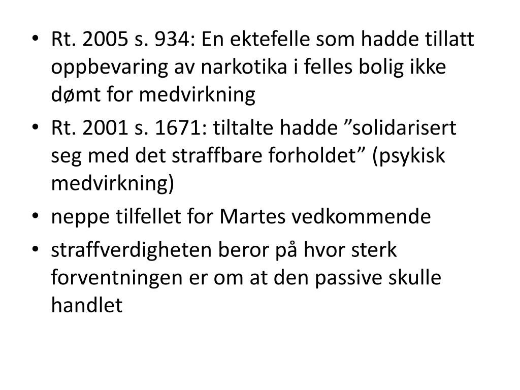 Rt. 2005 s. 934: En ektefelle som hadde tillatt oppbevaring av narkotika i felles bolig ikke dømt for medvirkning • Rt. 2001 s. 1671: tiltalte hadde ”solidarisert seg med det straffbare forholdet” (psykisk medvirkning) • neppe tilfellet for Martes vedkommende • straffverdigheten beror på hvor sterk forventningen er om at den passive skulle handlet