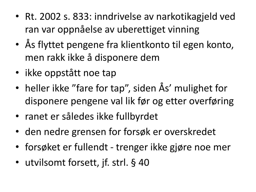 Rt. 2002 s. 833: inndrivelse av narkotikagjeld ved ran var oppnåelse av uberettiget vinning • Ås flyttet pengene fra klientkonto til egen konto, men rakk ikke å disponere dem • ikke oppstått noe tap • heller ikke ”fare for tap”, siden Ås’ mulighet for disponere pengene val lik før og etter overføring • ranet er således ikke fullbyrdet • den nedre grensen for forsøk er overskredet • forsøket er fullendt - trenger ikke gjøre noe mer • utvilsomt forsett, jf. strl. § 40