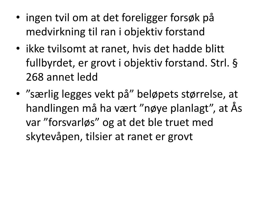 ingen tvil om at det foreligger forsøk på medvirkning til ran i objektiv forstand • ikke tvilsomt at ranet, hvis det hadde blitt fullbyrdet, er grovt i objektiv forstand. Strl. § 268 annet ledd • ”særlig legges vekt på” beløpets størrelse, at handlingen må ha vært ”nøye planlagt”, at Ås var ”forsvarløs” og at det ble truet med skytevåpen, tilsier at ranet er grovt